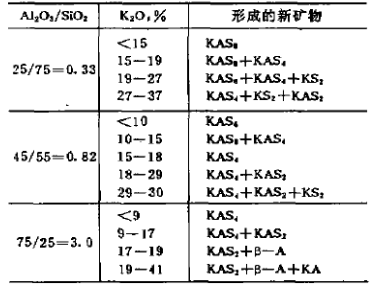 Al2O3/SiO2=0.82相當于Al2O3含量45%的粘土磚,K2O含量>15%時,開始有白榴石形成,磚會發生“堿裂”。