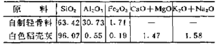 主要原料為自制輕骨料和白色稻殼灰;瘜W成分見表2,輕骨料的容量為1.61g/cm3、顯氣孔率為42%,耐壓強度27MPa。