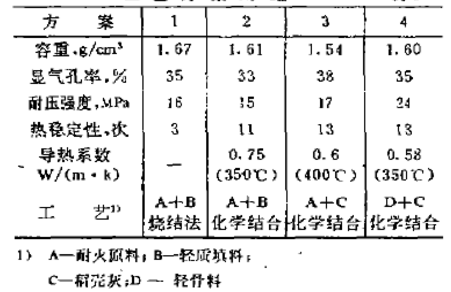 傳統的制造隔熱磚的方法是在原料中添加可燃物或輕質填料,機壓成型并經高溫煅燒而成,或直接用輕質原料制作。其制品強度低,耐磨性差,不能直接作耐火襯里。本試驗選擇了幾種新工藝。其制品性能見表3。